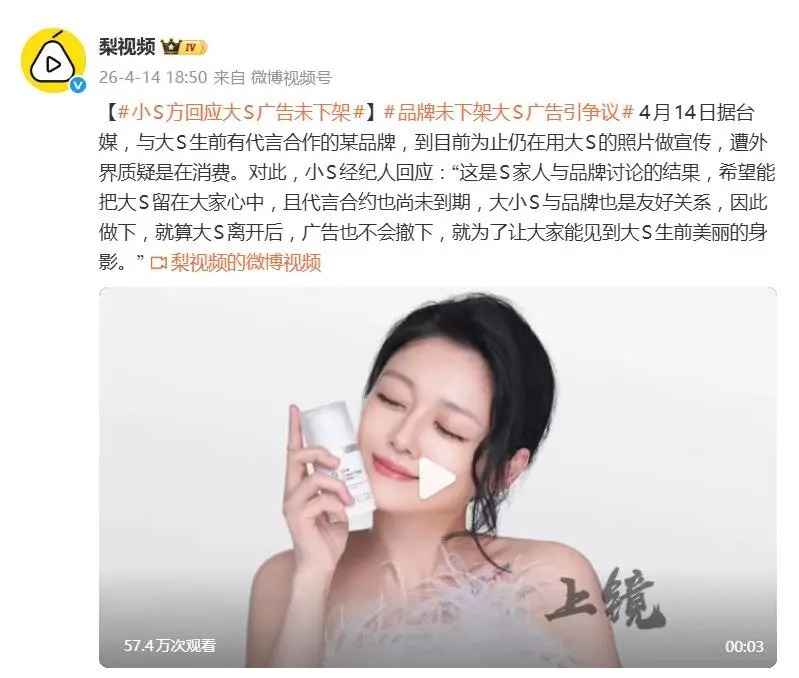 据台媒4月14日报道,针对外界关于品牌是否在“消费”逝者的质疑,徐熙娣(小S)的经纪人对此作出了正式回应。经纪人表示:“这是S家人与品牌讨论的结果,希望能把大S留在大家心中。且代言合约也尚未到期,大小S与品牌也是友好关系,因此决定,就算大S离开后,广告也不会撤下,就为了让大家能见到大S生前美丽的身影。”