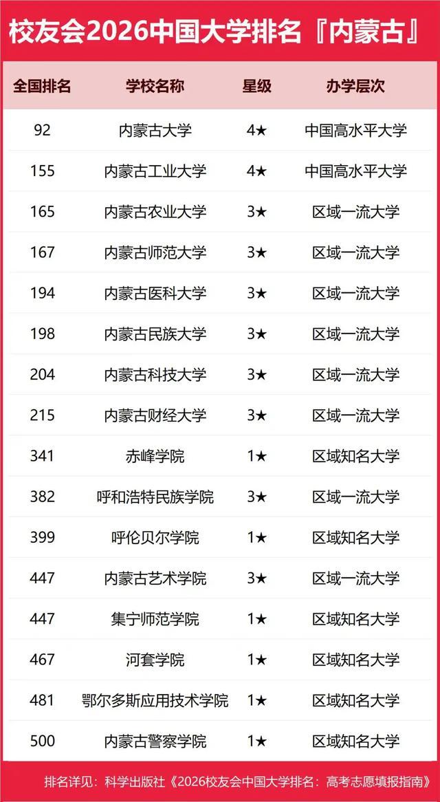 呼和浩特民族学院排在区内第十位,全国第三百八十二名,是三星级区域一流大学。呼伦贝尔学院排在第十一名,全国第三百九十九名,是一星级区域知名大学。内蒙古艺术学院和集宁师范学院都排在自治区第十二位,全国都是第四百四十七位,前者是三星级区域一流大学,后者是一星级区域知名大学。河套学院排在第十四名,全国第四百六十七名。鄂尔多斯应用技术学院排在第十五名,全国第四百八十一名。内蒙古警察学院属于第十六名,全国第五百名。三所学院都是星级区域知名大学。这些建立在不同盟市的是内蒙古高等教育结构化发展的力量,办学层次、办学定位不一样,但是它们一起构成了内蒙古高等教育的骨架,使内蒙古高等教育能够满足社会多样化的需要。