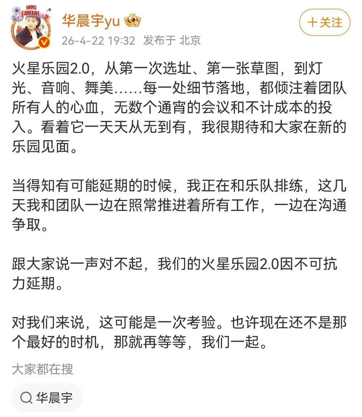 4月22日晚,歌手华晨宇发文致歉,在云南举办的火星乐园2.0因不可抗力延期。随后,他开直播时没忍住哭了。当晚,火星演唱会官方微博发文公布退票方案。4月23日,潇湘晨报·晨视频记者致电澄江市文旅局,工作人员表示延期原因以官方公告为准。